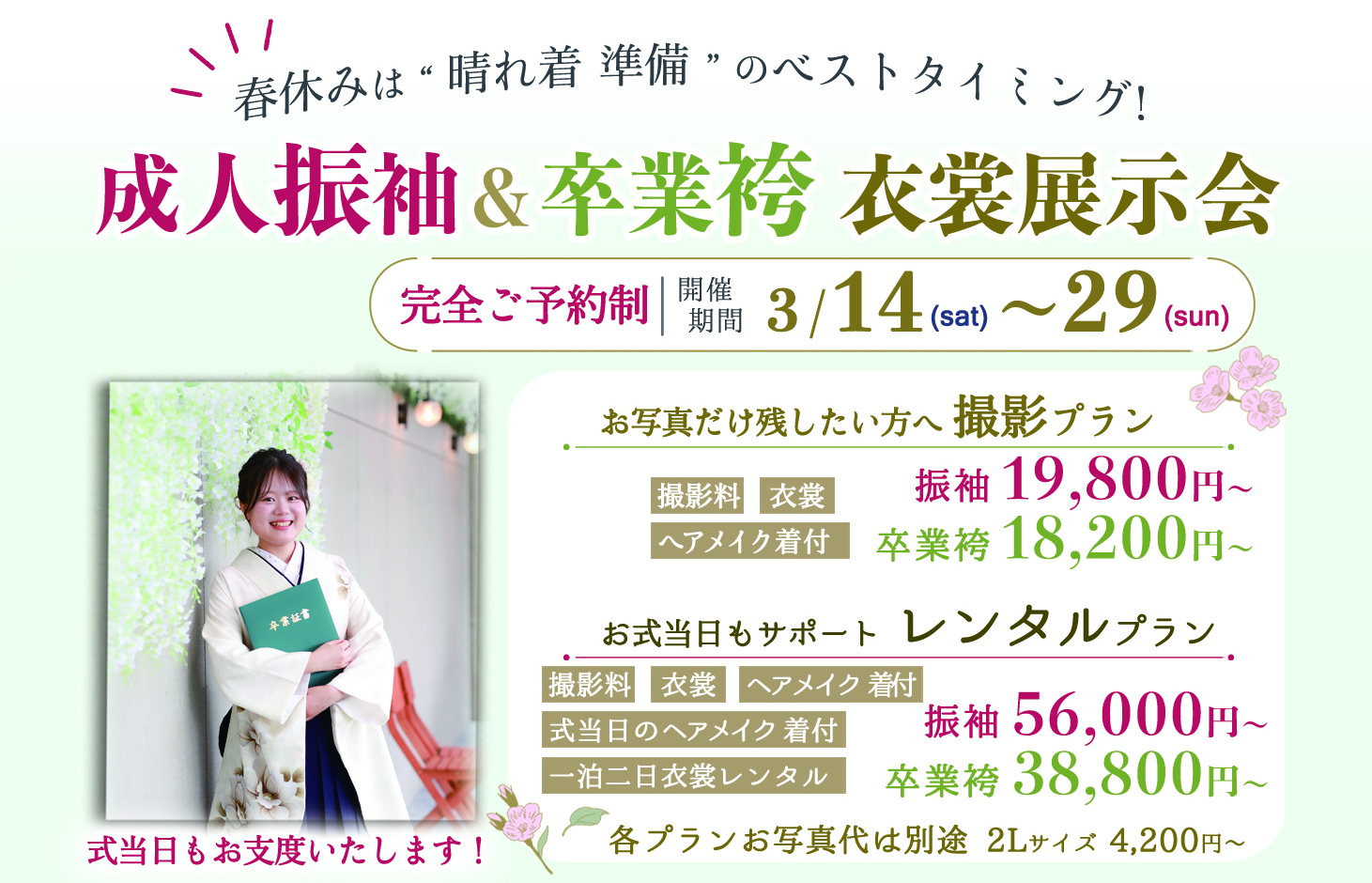 【3/14~29】成人振袖・卒業袴衣裳展示ご予約会開催!3大特典ご用意